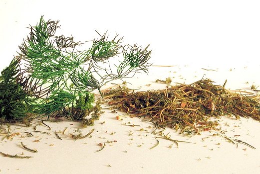 I have used for making trees a product called "Ming Fern" and usually I buy it in a dried form, however, on occasions I have bought it as a living plant and let it dry itself. I have found that when it dries out, it turns a yellowish/brown colour and the leaves (If you can call them that) look like pine needles and fall off in abundance. I tend to use the pine needles as an effect for real pine needles sprinkled around the ground cover.