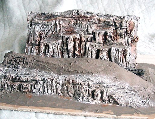 There are numerous ways of making formers to make your mountains, from elaborate wood carvings of the desired mountains to rolled up newspaper. Also expanded polystyrene can be used, these can be bought in 1/2" 1" or 2" thick which come in 8' X 4' sheets. They also come in various colours, white, pink, or blue. Also various textures of each. You could also use 1/2" insulation board (Sound board) broken up and placed one on top of the other to create a small hillside. My way of making hillsides and mountains are described below.