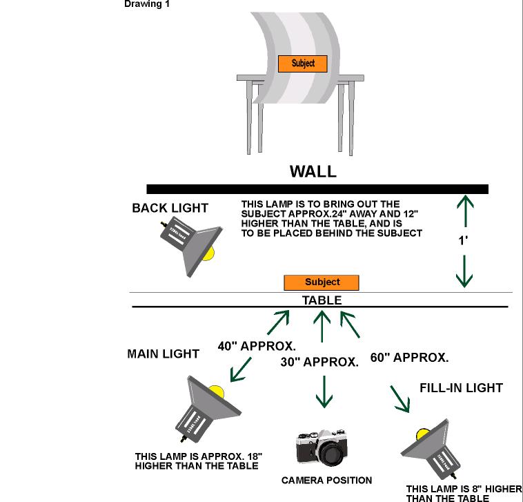 Drawing No.1 shows the position and distances for each of the three lamps. All distances, i.e. 24" - 4O" and 6O" are only approximate, and besides you may have to move them slightly to get rid of any unwanted harsh shadows that may fall on the